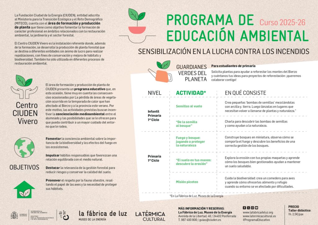 El área de formación y producción de planta de CIUDEN presenta un programa educativo que, en esta ocasión, tiene muy en cuenta las consecuencias ocasionadas por los incendios forestales que han afectado al Bierzo y a la provincia de León este verano. Por este motivo, las actividades previstas buscan incentivar la concienciación medioambiental entre el alumnado y las posibilidades que se le ofrecen para que pueda contribuir a un mayor cuidado del entorno que le rodea.